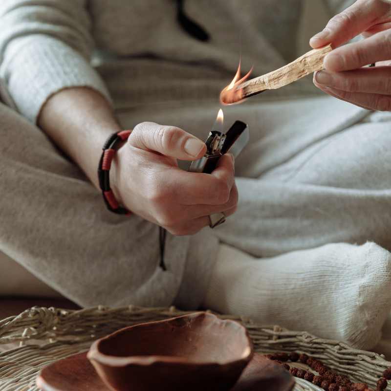 To begin, light one end of your palo santo stick, allowing it to burn for about 30 seconds to a minute before gently blowing out the flame, letting the embers glow and smoke to emanate freely.